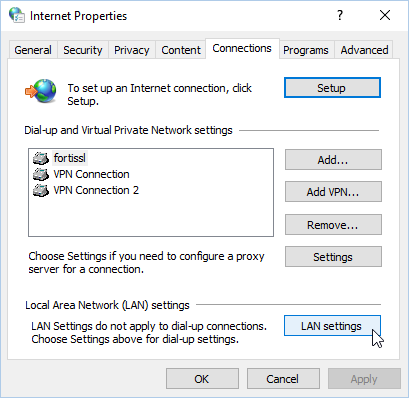 - Click the Connections tab, and then click LAN Settings.