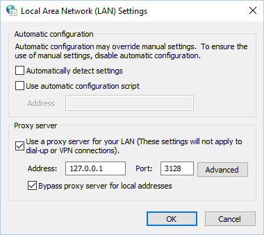 - Under Proxy server, check the check box for using a proxy server for your LAN.