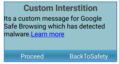 - You should use the onSafeBrowsingHit callback and the setSafeBrowsingResponse Method together to create a custom interstitial page when the Browser widget loads a flagged URL.