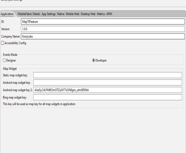 - Navigate to the Properties->Application tab. In the Map Widget section, add the key generated above in the Android map widget key 2 field.