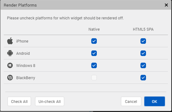 Unlike the Visible property, the Render property does not include the widget in the code generated for the excluded platforms and hence the generated code results in an optimized application for the excluded platforms.