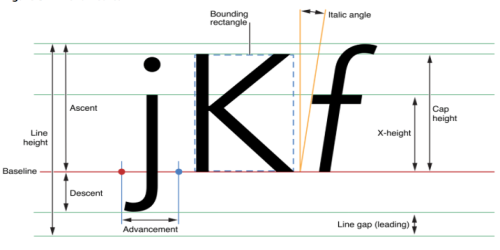 A font's metrics and text style as defined for Android and iOS as shown in the following diagrams.