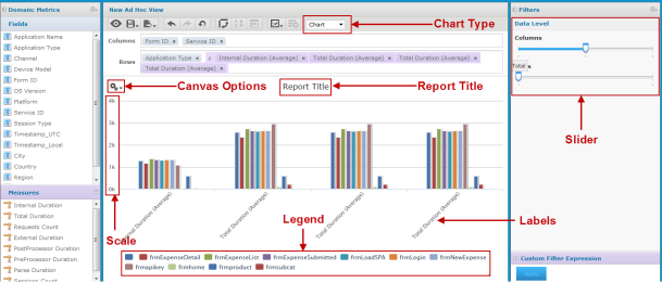 The following figure illustrates the Canvas or Report Builder area in the Ad Hoc Editor. Sliders in the Filters pane are also shown: