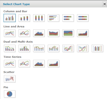 - Click Chart Types.. option. The following dialog appears. Click to select a chart type. A blue border indicates the current selection.