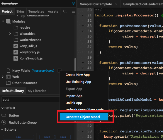 - Navigate to the Project menu, and right-click Quantum Fabric app, and select Generate Object Model. Now, the object service is enabled for Data Pre and Post Processors for Models registration. You can now write your logic to be applied for selected fields in the data model.