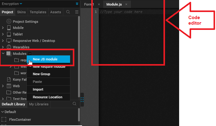 - Navigate to the Project menu, and right-click Quantum Fabric app, and select New JS module. A new JS module is created, and the Code editor become active.