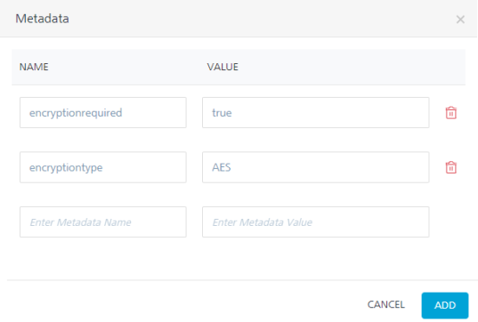 "metadata": {"enableEncryption": true, "encryptionAlgorithm": "AES", "encryptionKey": "XXXXXX"}