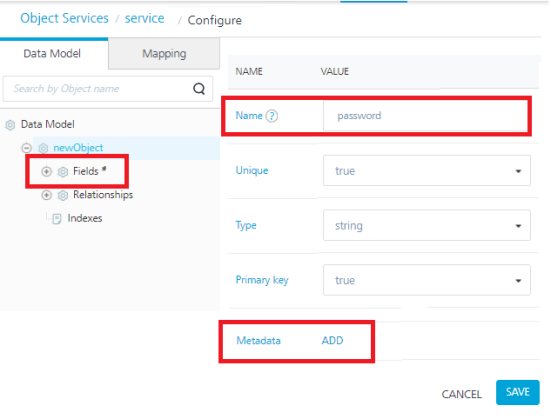- Click Add to create a field. Specify the field name and data type and primary key, as required. Add fields in the object.