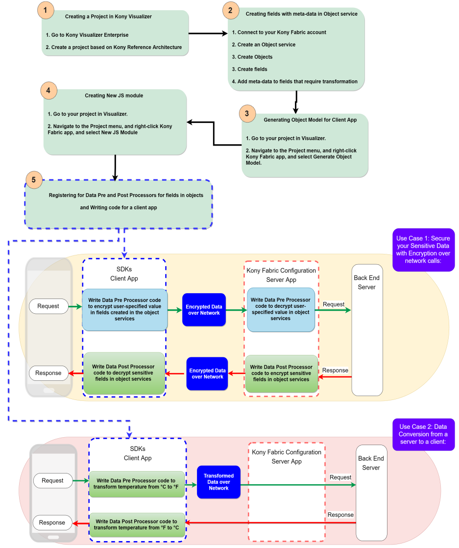 function preProcessor(value, context) { value = encrypt(value); //transformation logic to be applied before sending over the network. return value; } function postProcessor(value, context) { value = decrypt(value); //transformation logic to be applied before returning value to user. return value; } - Register fields in objects with theData Pre and Post Processors for the client app.