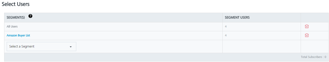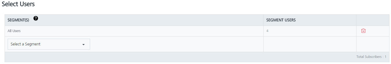 Segments Element Description Segment(s) Displays the segment name. Segment Users Displays the number of associated users with a segment Delete icon Click the Delete icon to remove a segment from the Select Users list view Total Subscribers Displays the number of associated subscribers with a segment - There are two options to add a segment: