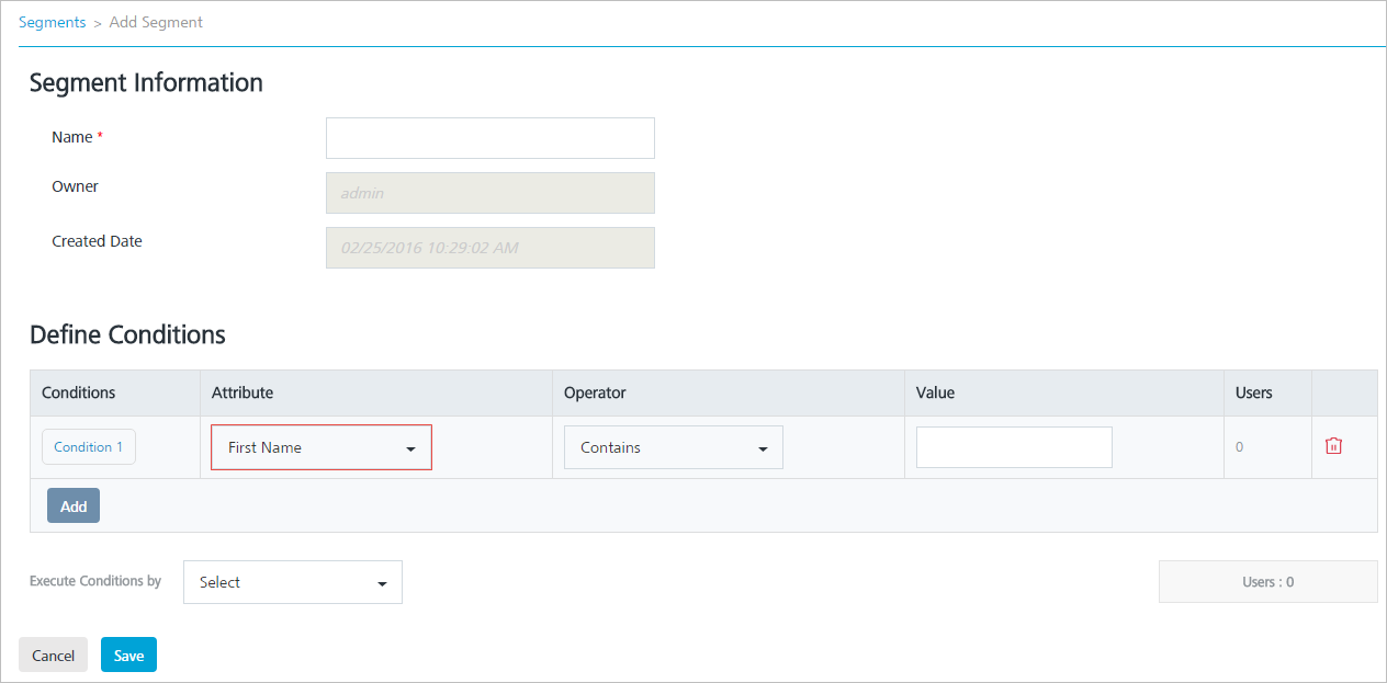 The added user attribute appears in Engagement >Segment > Add Segment.