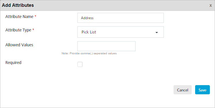 - Pick List: If you have selected attribute type as the Pick List, the Allowed Values text field appears. In the Allowed Values text field, enter the multiple values according to your attribute name, such as Sales, Finance, MIS.