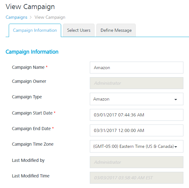 The View Campaign screen appears. The View Campaign screen includes the three tabs: Campaign Information, Select Users and Define Message. By default, the Campaign Information tab is set to active.