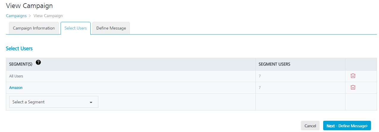 - The Select Users screen appears. Based on your requirement, select the segment from the Select a Segment drop-down list or add a new segment.