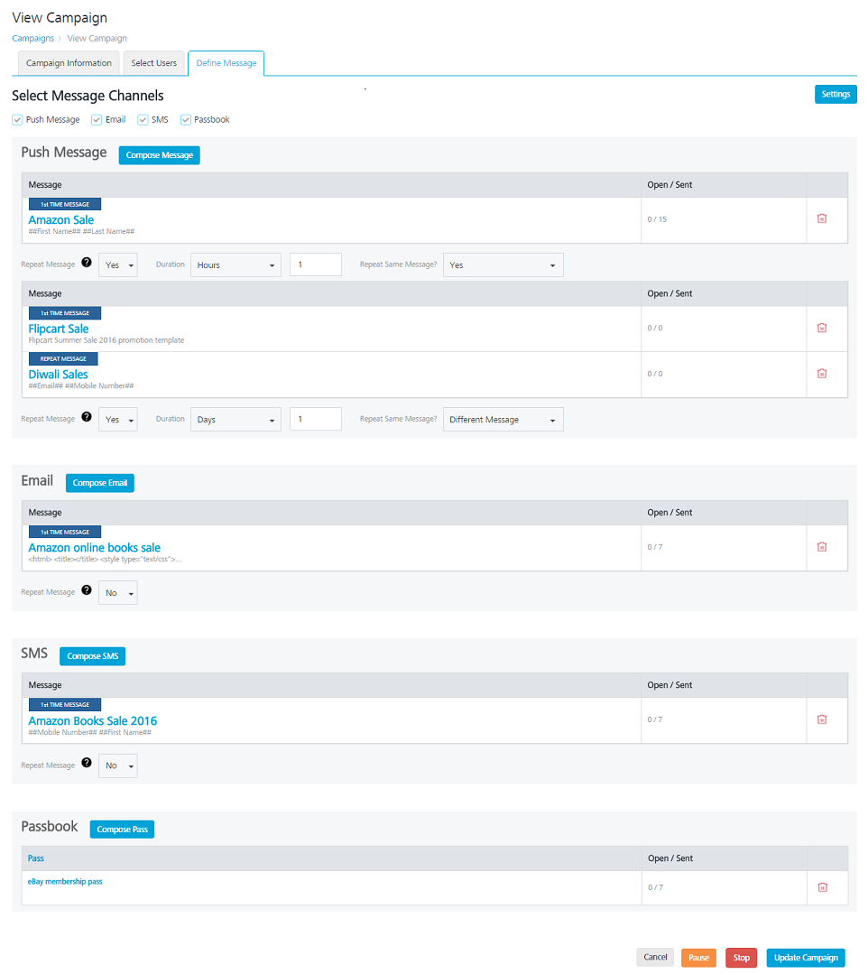Based on your requirement, you can update a campaign’s details. You can also update the details of a running campaign.