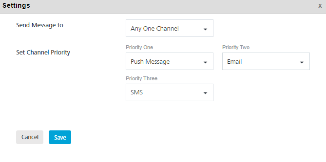 You can set channel priority to send messages to users through the Settings button available on Campaign > Define Message page. The Settings button becomes active when you select at least two channels. There are four options available to send messages to users: push message, email, SMS, and Passbook.