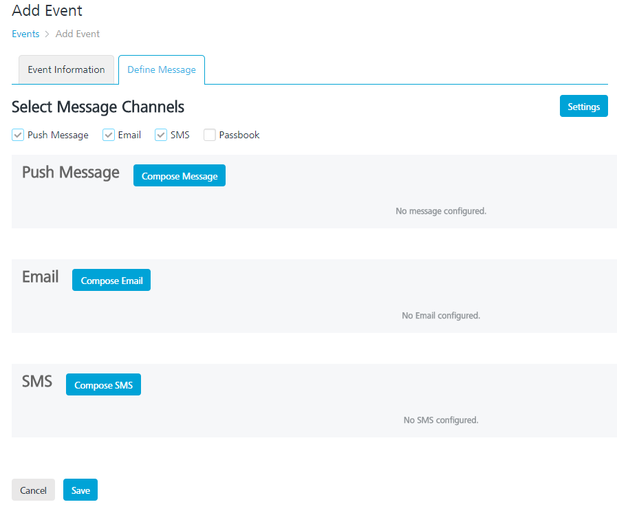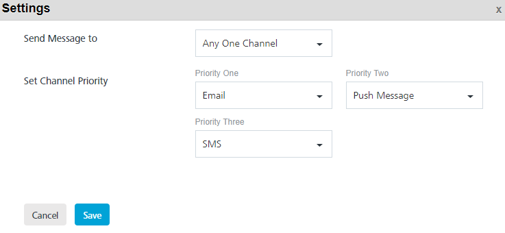 You can set channel priority to send messages to users through the Settings button available on the Events > Define Message page. The Settings button becomes active when you select at least two channels. There are four options available to send messages to users: push message, email, SMS, and Passbook.