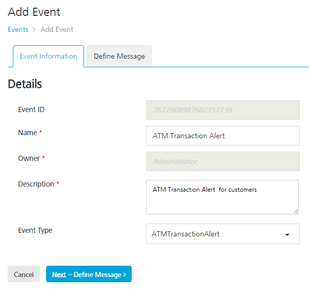 - Click Save to continue. The system displays the Add Event > Define Message page.