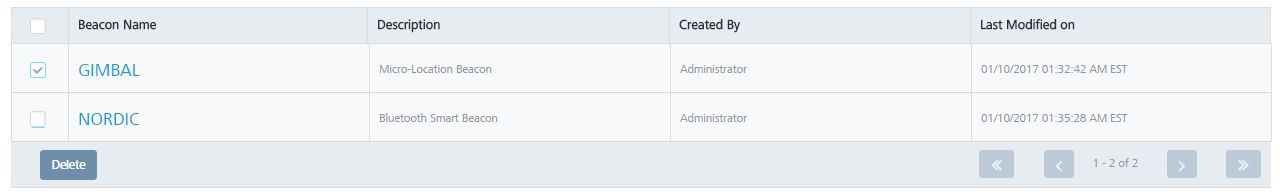 - Select the check box adjacent to the beacon name you want to delete, under the Beacon Name column. When you select multiple beacons to delete, only eligible beacons are deleted.