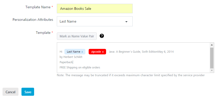 - To set the Name_Value pair, enter the key words in the SMS message text box and click the Mark as Name Value Pair button.