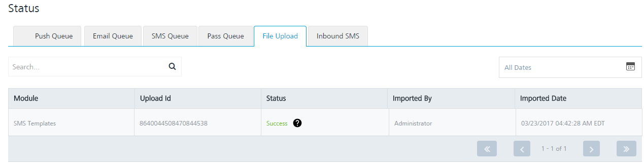 If the file upload is successful, the system displays the confirmation message that the file uploaded successfully and import is underway. The system also displays the assigned request ID. The uploaded SMS message templates appears in the SMS Template list-view on the Templates page.