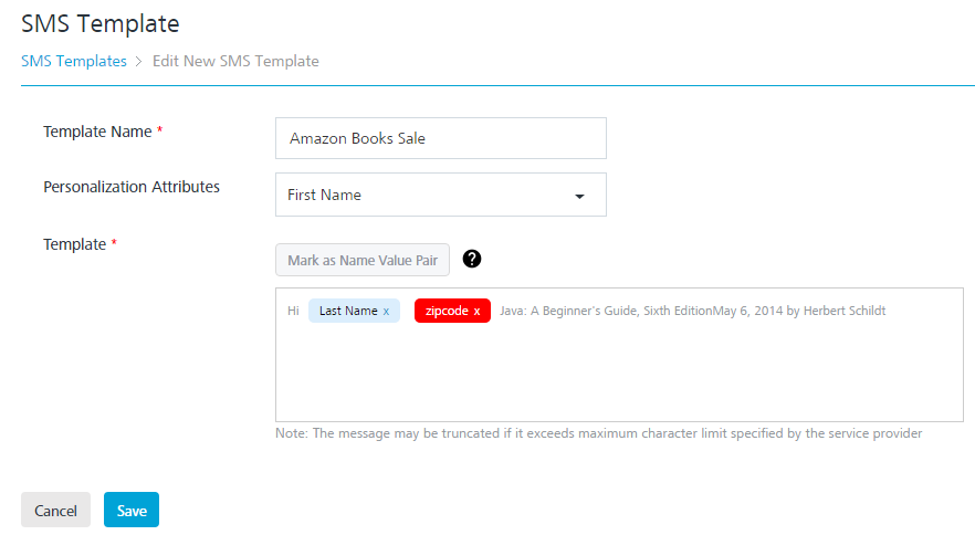 SMS Message Template Element Description Modification Allowed Template Name SMS template name Yes Personalization Attributes There are default personalization attributes: First name, Last name, Email, Mobile number, Country, and State Yes Mark as Name Value Pair A key-value pair is a set of two linked data items: a key, which is a unique identifier for a data type, and its value: the data such as, county:Iowa, state: wisconsin Yes - Click the Cancel button to exit from the window without saving any information.