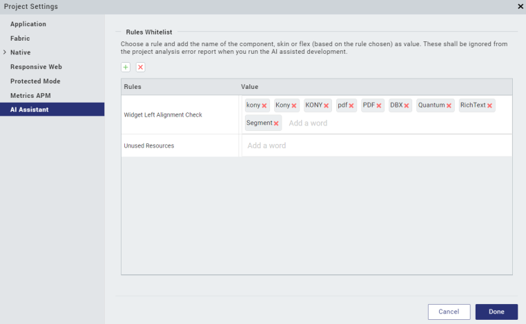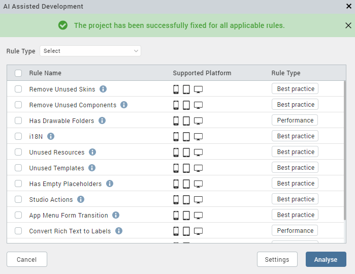 AI Assisted Development helps the developers in scanning the project for unused skins, resources, and widgets before building an application. The AI Assisted Development also helps you to analyze the project for increasing the performance by checking if heavy widgets like RichText can be replaced with light widgets like Label.
