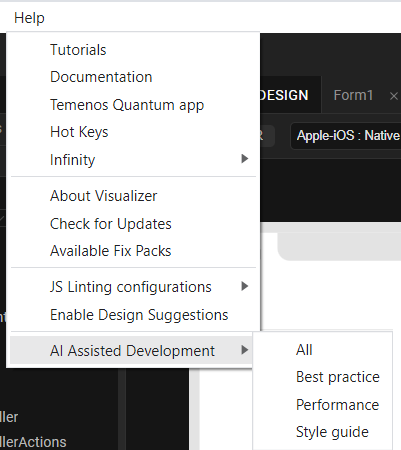 - From the main menu, navigate to Help > AI Assisted Development.