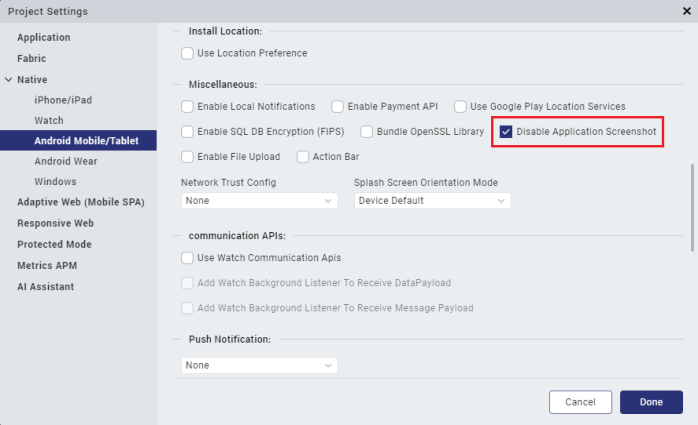 The Project Settings dialog box appears. - From the left pane, expand the Native tab, and then select the Android Mobile/Tablet sub-tab.