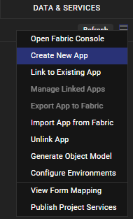 - Create a new Quantum Fabric application or use an existing one. To do so, on the Data and Services panel, click the context menu arrow, and then click either Create New App, or Use Existing App, and then select from the Quantum Fabric Application dialog box the services application that you want to publish. The Quantum Fabric Console opens.