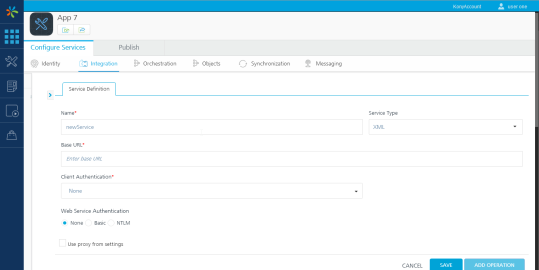 - Left Pane: Lists all the existing Integration Service and Orchestration Services available for the app. From here, select an orchestration Service or an operation from an integration service by clicking Add.
