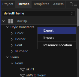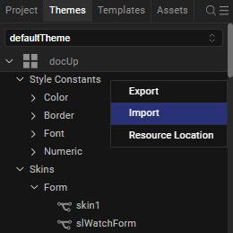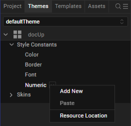 From Quantum Visualizer V9 SP3 GA, the Skins tab in the project explorer has been renamed as the Themes tab. In the Themes tab, you can configure new Style Constants for Colors, Borders, Fonts, and Numeric in addition to the existing Skin functionalities. By using the Style Constants feature, you can create and apply pre-defined styles for colors, fonts, borders, and numeric for use throughout the project. Using a Style Constant for Color, you can define the values for the type, color, and opacity for a background. Using the Style Constant for Font, you can define the values the for color, type, opacity, family, weight, style, and size for a font. Using a Style Constant for Border, you can define the values for the size, color type (Single Color), color, opacity, and style for a border. Using the Style Constant for Numeric, you can define the numeric values within border and font constant (border size and font size).