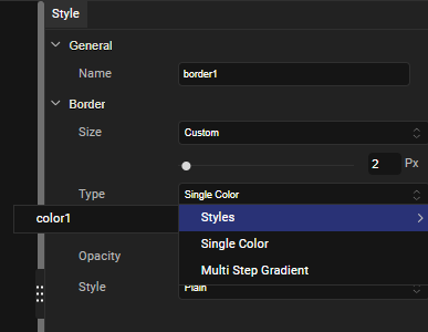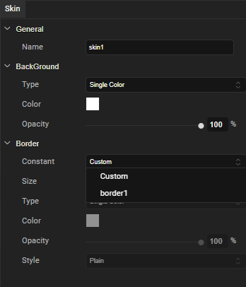 Using the Style Constant for Border feature, you can create a style constant based on the values of the Size, Color, Type, Opacity, and Style of the Border. Using these style constants, developers can instantly update the Skins present in a project. You can create multiple style constants for borders in a project.