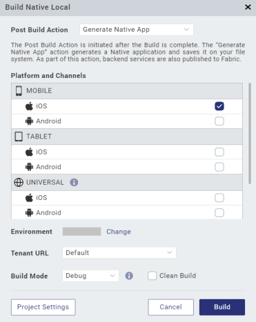 NOTE: The Build Native Local feature enables you to build an app on the local machine. To know more about the feature, click here. If you want to build the app on the cloud, select Build and Publish Native.