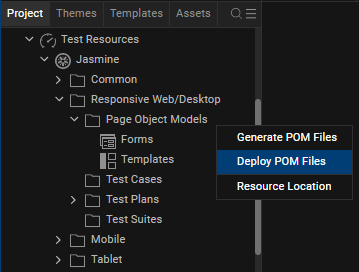 • The Page Object Model files for Templates appear in the Test ResourcesJasmine > <Channel> (Mobile, Tablet, or Responsive Web) > Page Object Models > Templates section of the Project Explorer.