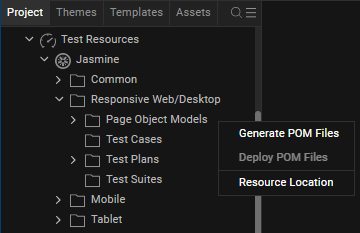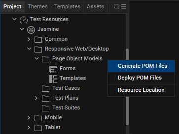 NOTE: To generate the Page Object Model files for the complete project, from the Project Explorer > Test Resources section, right-click Jasmine, and then select Generate POM Files.