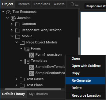 3. Expand the Page Object Models > Forms (or Templates or Components) folder, and right-click the POM file that must be generated again.