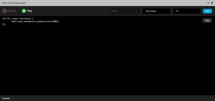 To play the recorded script, re-launch the app and click Play. The recorded script plays in the Visualizer Preview window. You can view the result of the test case in the Console tab.