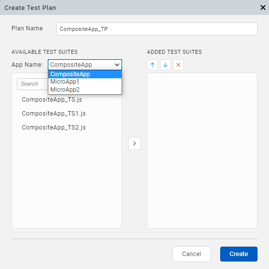 NOTE: The Available Test Suites section displays a list of all the test suites available in the Base App. To add test suites from a dependent micro app, select the Micro App from the App Name drop-down list.