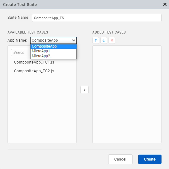 NOTE: The Available Test Cases section displays a list of all the test cases available in the Base App. To add test cases from a dependent micro app, select the Micro App from the App Name drop-down list.