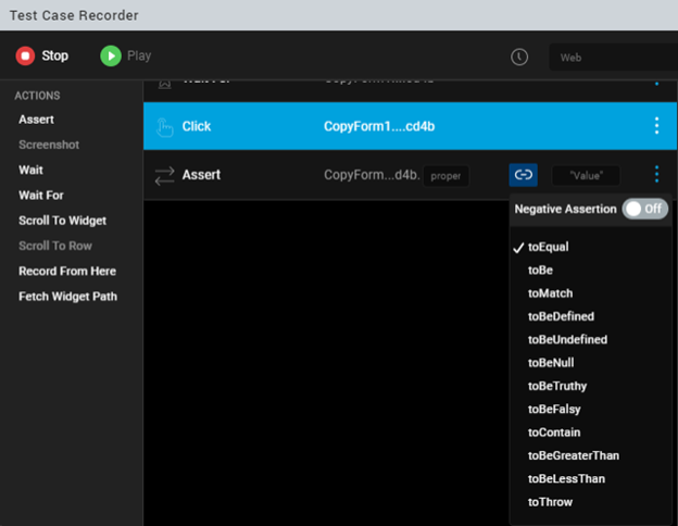 4. To complete the Fetch Widget Path action, select any of the following actions from the left of the Test Recorder window as per your requirement: Wait For, Assert, and Scroll to Widget.