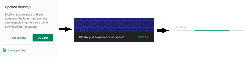 The flexible approach provides a user experience that supports the download and installation of the update in the background and has a graceful state monitoring. Developers can use this approach when an app update does not affect the core functionality of the app, or contains a new feature. Use this approach when it is acceptable for the user to continue using the app while the update is downloaded and installed in the background.