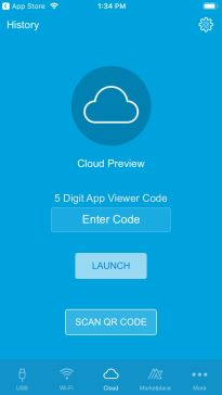 • Launch by using the App Viewer ID. If it is not already highlighted, tap the Cloud icon at the bottom of the screen. Next, tap the Enter Code field, type the publish code for the preview you just published, and tap the Launch button. Or, you can just tap the Scan QR Code button to auto-populate the required details and preview the app.