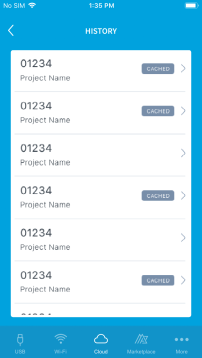• Open a previous preview. Tap the History icon at the bottom of the screen to see the list of previews previously viewed on the device. A previous preview can be stored on the cloud and can be accessed on any device by using the same cloud credentials. If the preview is cached locally on the device, it can be viewed without a wireless connection; the Quantum App's listing includes a Cached status. If the application preview has an update available for download, its listing includes an Update status.