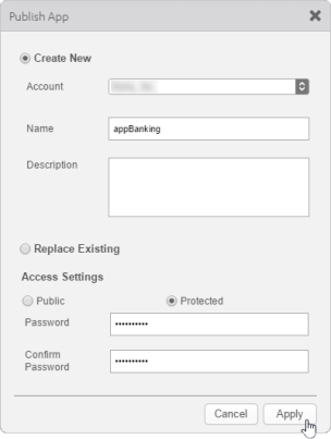 3. The Publish App dialog box displays. If the project does not have an existing preview with a publish code, the dialog box displays only a Create New option.
