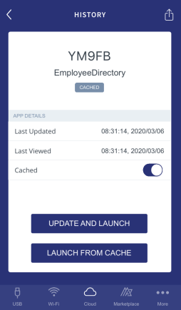 • Open a previous preview. Tap the History icon at the bottom of the screen to see a list of previews previously viewed on the device. A previous preview can be stored on the cloud and can be accessed on any device by using the same cloud credentials. If the preview is cached locally on the device it can be viewed without a wireless connection, the Quantum App's listing includes a Cached status. If the application preview has an update available for download, its listing includes an Update status.