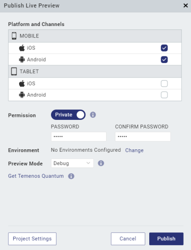 • Cloud. On the Build menu, click Publish Live Preview. The Publish Live Preview window appears.