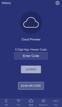 • Launch by using the App Viewer ID. If it is not already highlighted, tap the Cloud icon at the bottom of the screen. Next, tap the Enter Code field, type the publish code for the preview you just published, and then tap the Launch button. Or, you can just tap the Scan QR Code button to auto-populate the required details and preview the app.