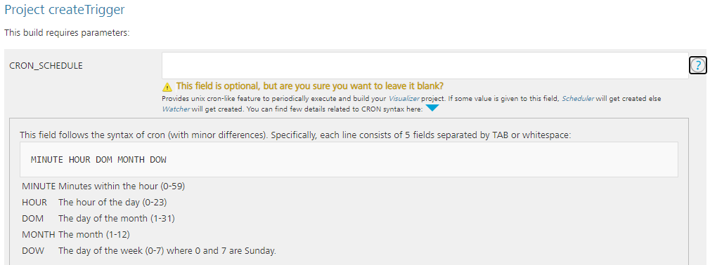 Alternatively, select the createTrigger job, and then select the Build with Parameters option from the left panel. - For the CRON_SCHEDULE parameter, make sure that the field is blank.