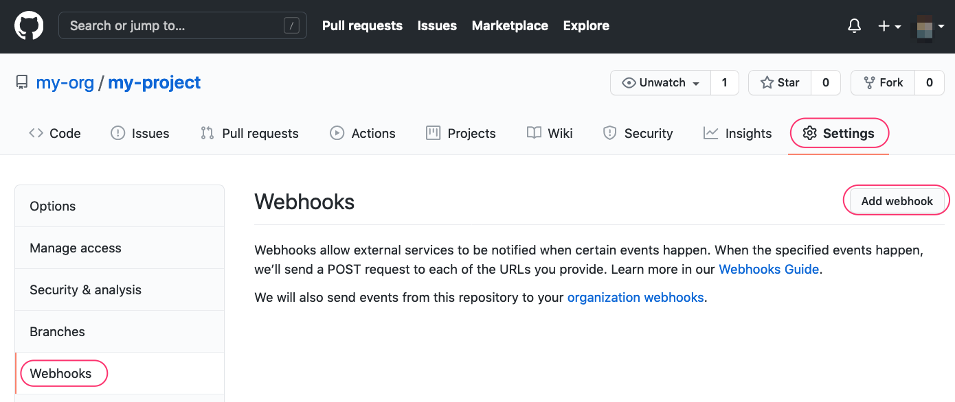 - Open your GitHub repository in a web browser, navigate to Settings → Webhooks, and then click Add webhook.